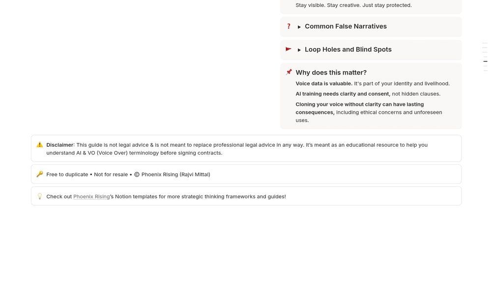 This short, interactive Notion guide breaks down how speech-to-text, text-to-speech, and voice cloning really work — and what each clause in those agreements actually means. You’ll learn how to spot hidden risks and make informed decisions without fear or confusion.