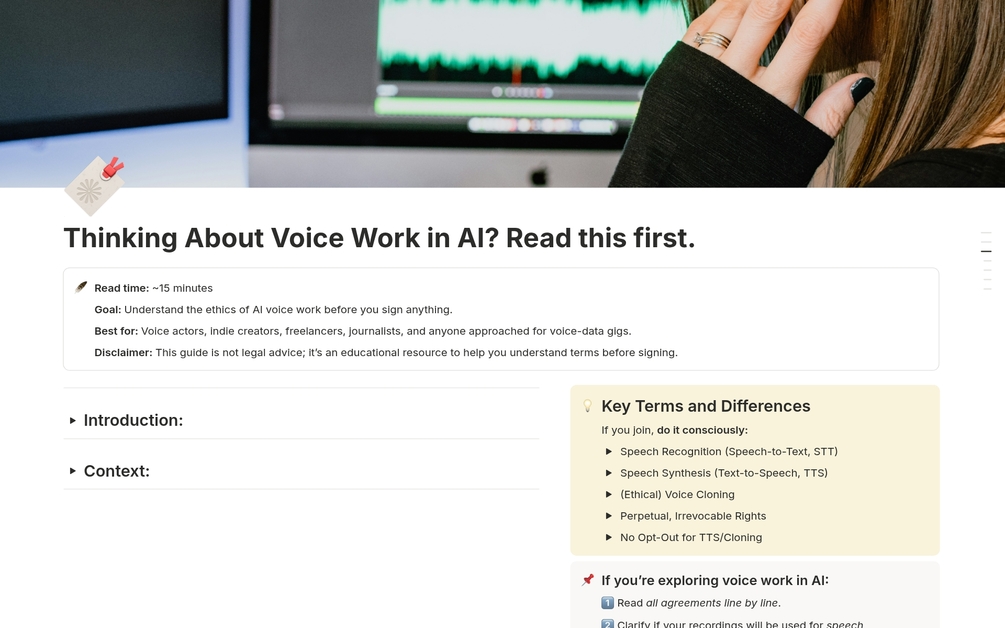 A 20-minute Notion guide that helps voice actors and creators understand what they’re really signing when joining AI voice data projects. learn to protect your voice, rights, and identity.