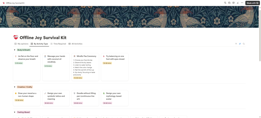 This is a one-page Notion toolkit I built to stay grounded, creative, and okay when everything else goes offline.